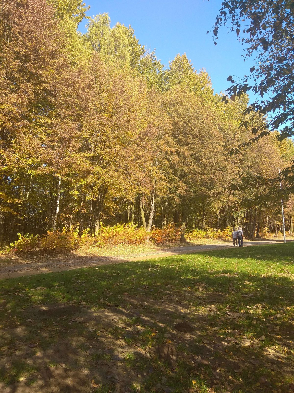 Park dziś pełen dźwięków. Kolory jesieni są oczywiste. Ale w dźwięki trzeba się wsłuchać. Szelest opadających wilgotnych liści, mokre plaśnięcie, gdy uderzają w asfalt alejki. Odległy, hipnotyczny stukot pociągu. Ptaki, jakby zdziwione tym wybuchem wiosny jesienią – śpiewają i cichną. W ściółce słychać każdy szelest… Gorące słońce i październikowy pożar – pomarańczowo, złoto, czerwony – drzew… Chłód ciągnie od ziemi i z mglistego cienia zarośli.